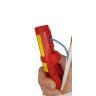 Многофункциональный инструмент для снятия изоляции Felo 58401611 предназначен для зачистки всех распространенных круглых кабелей диаметром от 8 до 13 мм. Он не требует установки глубины резки, так как высокопрочное лезвие специальной формы, покрытое нитрид-титаном, автоматически подстраивается к размеру кабеля. Инструмент имеет несколько лезвий различного назначения: для продольной и поперечной резки оболочки, также выдвижной нож для резки кабеля, устройство для снятия изоляции для круглых проводников сечением от 0,5 до 6,0 мм. Нож не используется при работе под напряжением, т.к. не имеет диэлектрического покрытия.