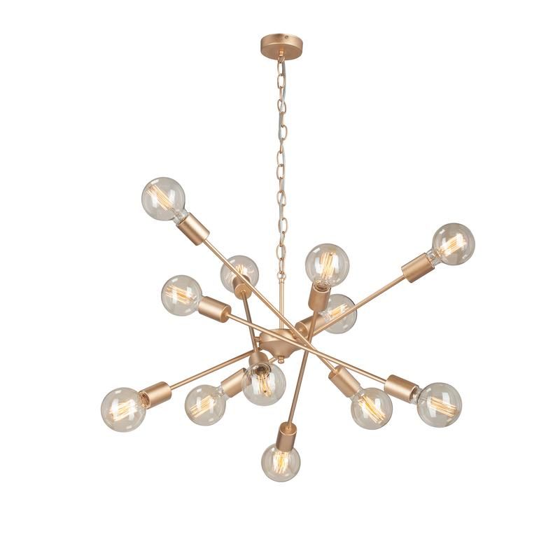 Люстра подвесная Vitaluce V4750-8/12 на двенадцать ламп под цоколь Е27 в стиле лофт будет прекрасным дополнением для любого интерьера. Люстра на потолок может украсить не только вашу гостиную, столовую или спальню, он также идеально впишется в лофт пространства, кафе, рестораны и другие общественный места. Подвесная люстра изготовлена из металлического каркаса. Цвет арматуры - золотистый. Возможна установка светодиодных, энергосберегающих, филаментных или ламп накаливания. Площадь освещения при использовании ламп накаливания составляет 36 м2. При использовании светодиодной лампы мощностью до 8 Вт площадь освещения может быть увеличена до 60 м2. Люстра имеет возможность крепления на планку, что делает ее универсальной для монтажа к любым видам потолков. Обращаем ваше внимание, лампы в комплект не входят. Параметры изделия: высота - 96 см, длина - 74 см. Размеры потолочной чаши: высота - 2,5 см, диаметр - 9,8 см. Длина изделия регулируется. Прилагается инструкция по сборке и установке.