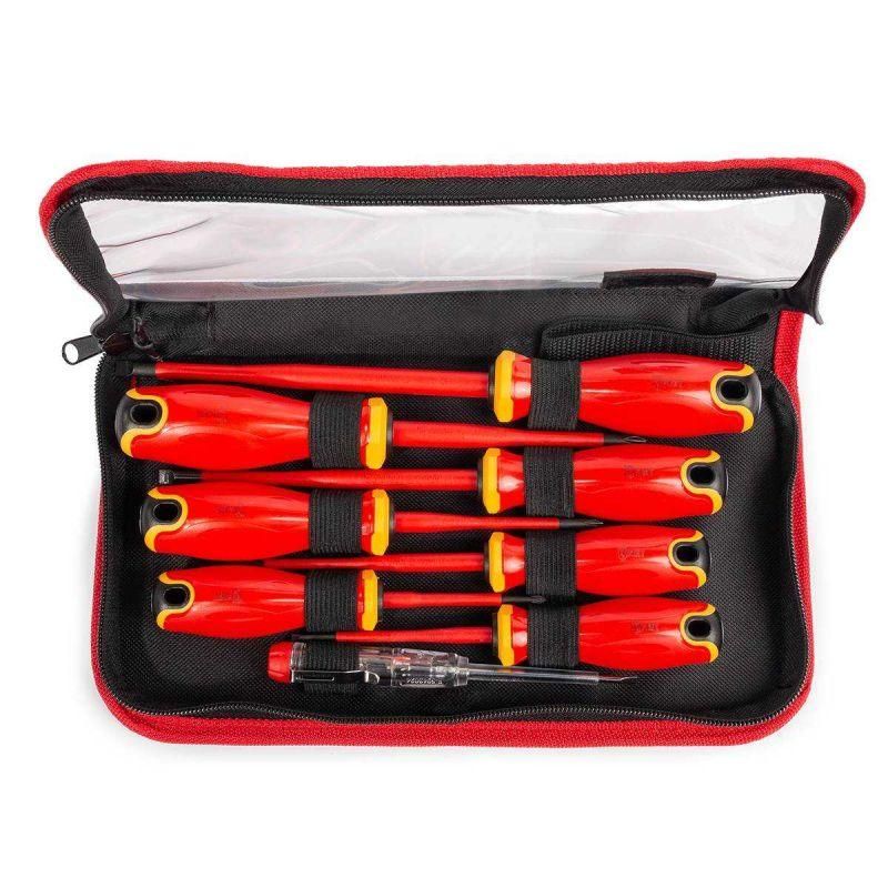 • Состав набора: • Отвертка диэлектрическая шлиц 2.5х75 • Отвертка диэлектрическая шлиц 4.0х100 • Отвертка диэлектрическая шлиц 5.5х125 • Отвертка диэлектрическая шлиц 6.5х150 • Отвертка диэлектрическая PH0х60 • Отвертка диэлектрическая PH1х80 • Отвертка диэлектрическая PH2х100 • Отвертка индикаторная • Для работ под напряжением до 1000 В • Утопленная в лезвие отвертки изоляция делает возможным монтаж винтов с глубокой посадкой • Материал стержня: сталь S2 • Намагниченные вороненные наконечники • Материал изоляции стержня: полипропилен • Маркировка на торце рукояток с обозначением типа профиля • Трехкомпонентная эргономичная рукоятка с мягкими вставками из термопластрезины • Специальная форма рукоятки с защитой от скатывания и отверстием для подвешивания • Упаковка: кофр на молнии с прозрачной крышкой • Вес набора: 602 г