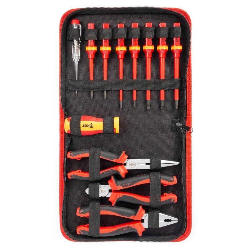 • Для работ под напряжением до 1000 В • Состав набора: • бокорезы диэлектрические СТАНДАРТ 160 мм • пассатижи диэлектрические СТАНДАРТ 180 мм • длинногубцы диэлектрические СТАНДАРТ 200 мм • рукоятка диэлектрическая для сменных бит • бита диэлектрическая сменная: шлиц 3.0 х100 • бита диэлектрическая сменная: шлиц 4.0 х100 • бита диэлектрическая сменная: шлиц 5.5х100 • бита диэлектрическая сменная: PH1х80 • бита диэлектрическая сменная: PH2х100 • бита диэлектрическая сменная: PZ1х80 • бита диэлектрическая сменная: PZ2х100 • тестер напряжения 110–250 В • Материал изоляции: • сменные диэлектрические отвертки: полипропилен • шарнирно-губцевый инструмент: термопластрезина • Упаковка: прочный тканевый кофр на молнии • Габариты упаковки: 250х205х40 мм • Вес набора: 1.20 кг