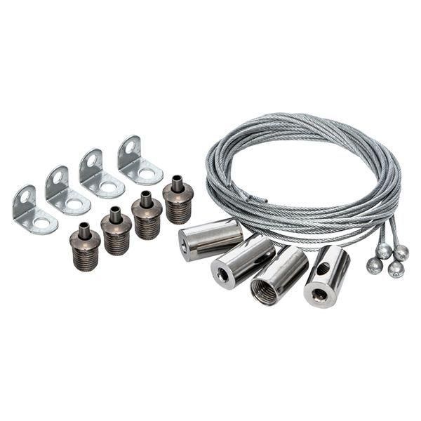 Комплект подвесов потолочный на тросах. Светодиодные панели легко монтируются на горизонтальные и наклонные поверхности при помощи креплений на тросах. Данную систему можно также использовать для подвеса светодиодных линейных светильников, а также ее можно использовать для подвеса шин для трековых светильников.