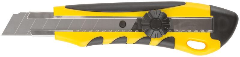 Применяется для резки бумаги, обоев,скотча, картона средней твердости.Сегментированное лезвие из инструментальной стали с вращающимся пластиковым прижимом. Пластиковый корпус с прорезиненными вставками обеспечивает крепкий захват и предотвращает выскальзывание при экплуатации.Металлические направляющие обеспечивают защиту лезвия от поломки и допускают увеличенные нагрузки